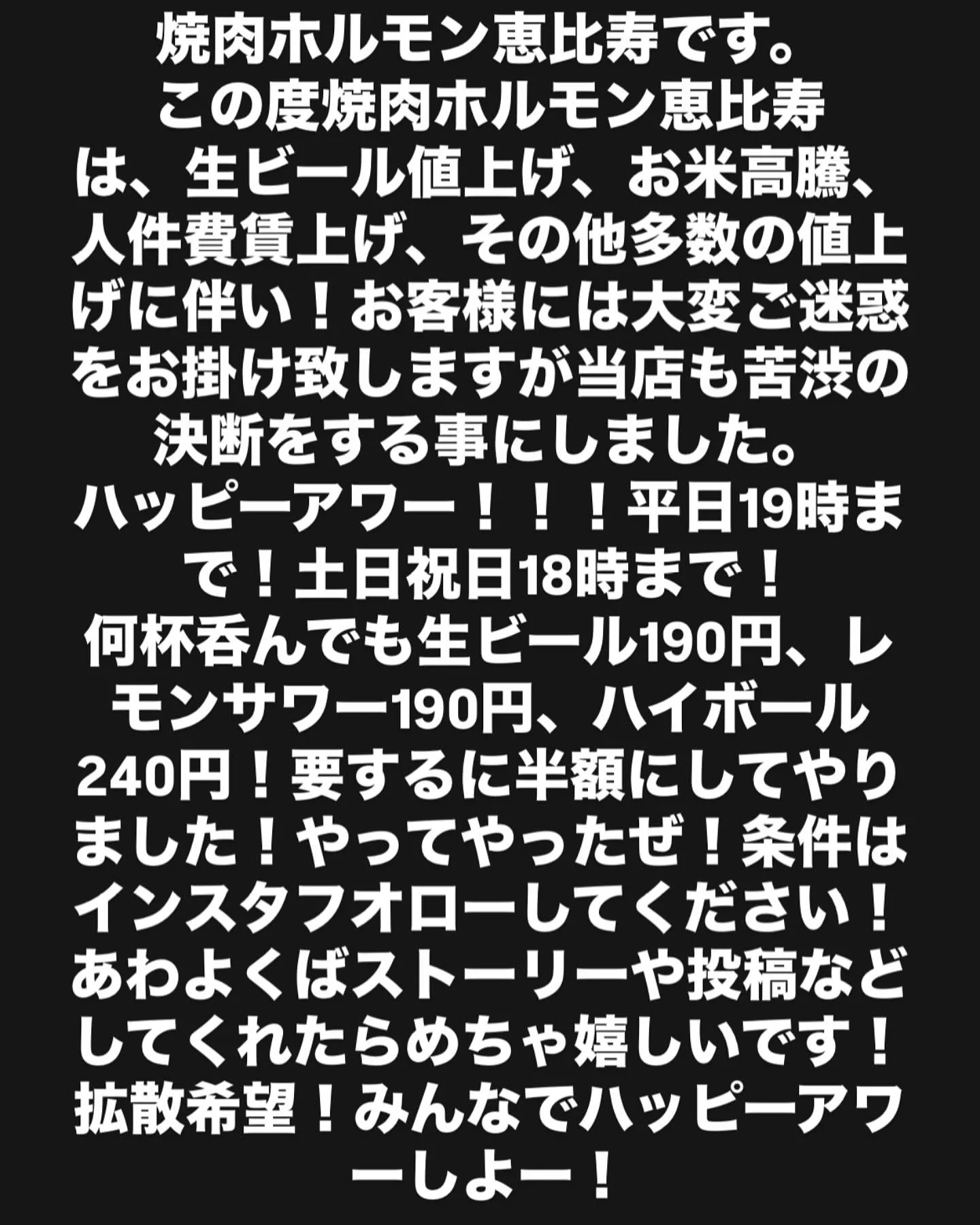 この度焼肉ホルモン恵比寿は、生ビール値上げ、お米高騰、人件費賃上げ、その他多数の値上げに伴い!お客様には大変ご迷惑をお掛け致しますが当店も苦渋の決断をする事にしました。