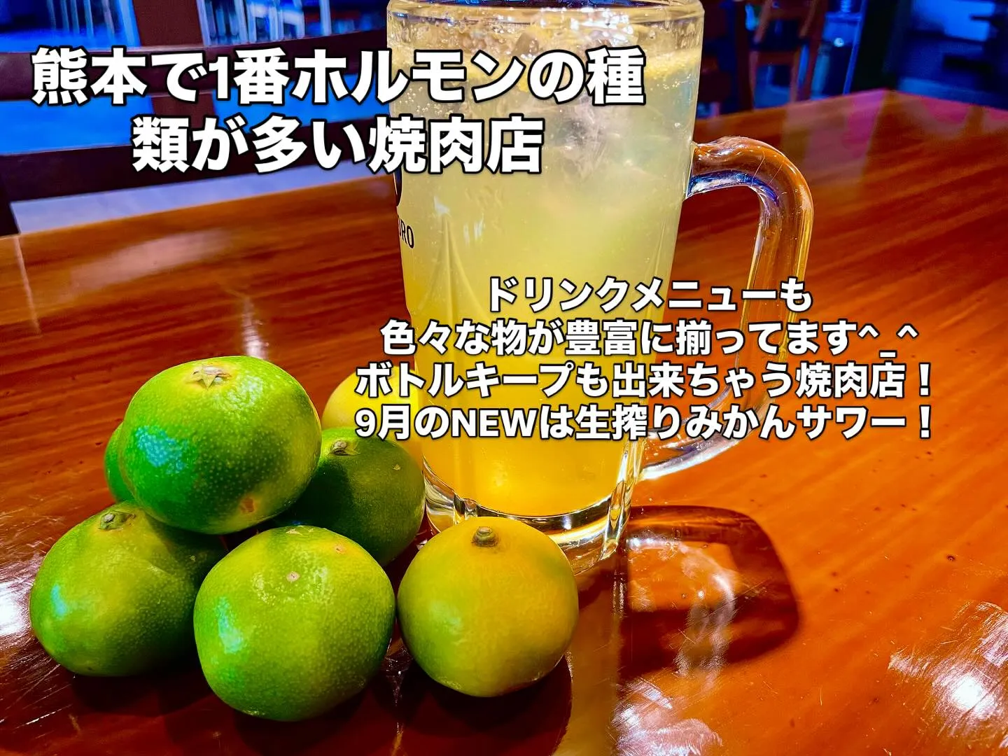 熊本で1番ホルモンの種類が多い焼肉店!焼肉ホルモン恵比寿です。9月から生搾りみかんサワーが新しく登場しました!熊本のみかんをギュギュッと絞ってご用意しております。中央区帯山の焼肉!9月も平日は19時までハッピーアワー開催中!生ビール190円!ハイボールやサワー系も半額でお得に飲める!中央区帯山でこんなお得に飲める場所は焼肉ホルモン恵比寿だけ!しかもカラオケ屋さんが2階にあるから2次会は上に上がるだけ!団体のご宴会も承っております。